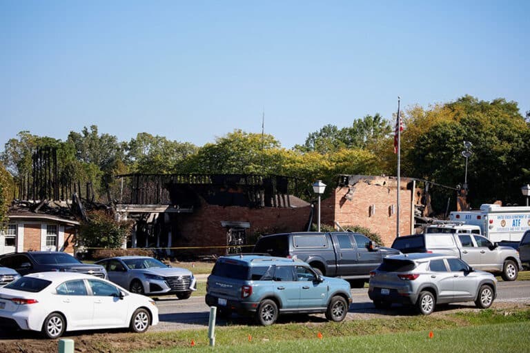 Xe cộ đỗ gần tàn tích của Nhà thờ Các Thánh Hữu Ngày Sau của Chúa Giê Su Ky Tô bị thiêu rụi, sau vụ xả súng hàng loạt, tại Grand Blanc, Michigan, ngày 29 tháng 9 năm 2025. (Ảnh của OSV News/Rebecca Cook, Reuters)
