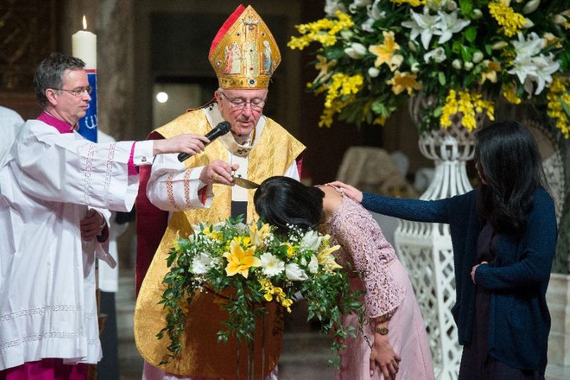 Cộng đoàn Kitô rất hoan hỉ đón nhận con. Nhân danh cộng đoàn, cha ghi dấu thánh giá cho con.