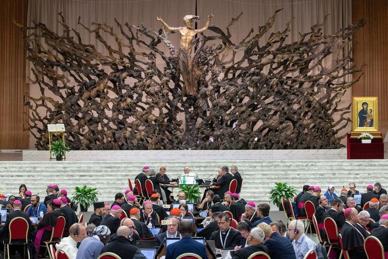 Đức Giáo Hoàng Phanxicô và các đại biểu khác tham dự kỳ họp thứ hai của Phiên họp thường kỳ XVI của Thượng hội đồng giám mục vào ngày 2 tháng 10 tại Hội trường khán giả Phaolô VI tại Vatican. (ảnh: Daniel Ibáñez / EWTN)