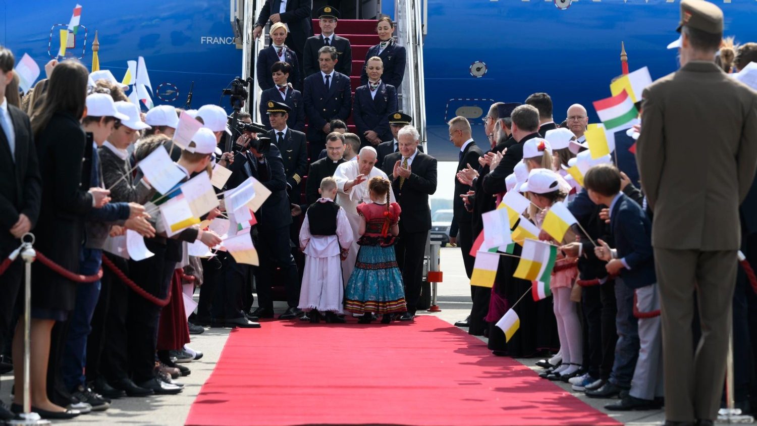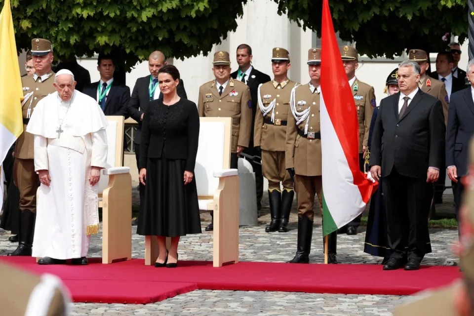 Cũng theo Vatican News, máy bay của Đức Giáo Hoàng hạ cánh xuống phi trường Quốc tế Frerenc Liszt của Budapest lúc 11 giờ 54 phút giờ địa phương. Chào đón ngài là phó thủ tướng Zsolt Semjén. Sau khi được giới thiệu các phái đoàn liên hệ, ngài được chở tới Dinh Sándor ở Budapest, nơi ngài gặp Tổng thống Hung gia lợi Katalin Novák và Thủ tướng Viktor Orban, trước khi nói chhuyện với các nhà cầm quyền, đại diện xã hội dân sự, và thành viên ngoại giao đoàn tại Đan viện Cátminh xưa, nay được dùng làm dinh thủ tướng.