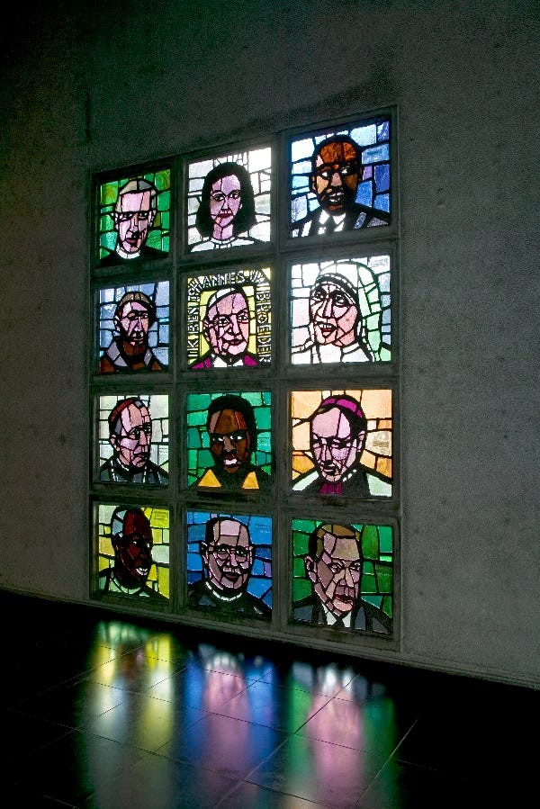 Một cửa sổ kính màu (trên cùng bên trái) mô tả Pierre Teilhard de Chardin, S.J., tại Nhà thờ St. Anne ở Heerlen, Hà Lan. Rijksdienst voor het Cultureel Erfgoed qua Wikimedia (CC BY-SA 4.0).)
