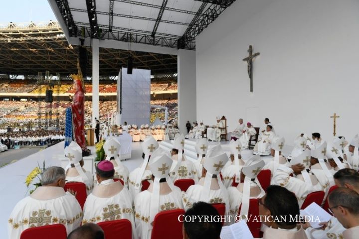 Thưa anh chị em, tôi cũng muốn nói với anh chị em, với quốc gia này, với quần đảo tuyệt vời và đa dạng này, đừng mệt mỏi khi ra khơi, đừng mệt mỏi khi thả lưới, đừng mệt mỏi khi mơ ước, đừng mệt mỏi khi xây dựng lại nền văn minh hòa bình. Luôn dám mơ ước về tình huynh đệ, đó là kho báu thực sự giữa anh chị em. Được hướng dẫn bởi lời Chúa, tôi khuyến khích anh chị em gieo hạt giống tình yêu, tự tin bước đi trên con đường đối thoại, tiếp tục thể hiện lòng tốt và sự tử tế của mình bằng nụ cười đặc trưng của anh chị em.