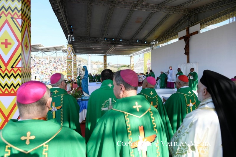 Chúa hôm nay cũng nói với anh chị em: “Hỡi người dân Papua, hãy can đảm lên, đừng sợ hãi! Mở ra! Hãy mở lòng đón nhận niềm vui của Tin Mừng, mở lòng đón nhận cuộc gặp gỡ với Thiên Chúa, đón nhận tình yêu thương anh em mình.” Cầu mong không ai trong chúng ta vẫn câm điếc trước lời mời gọi này. Và xin Chân phước Giovanni Mazzucconi đồng hành cùng anh chị em trên hành trình này: giữa bao khó khăn và thù địch, ngài đã mang Chúa Kitô đến giữa anh chị em, để không ai có thể điếc trước thông điệp vui mừng về ơn cứu độ, và mọi người có thể nới lỏng lưỡi mình để ca hát tình yêu Thiên Chúa. Mong rằng ngày hôm nay cũng như thế đối với anh chị em!