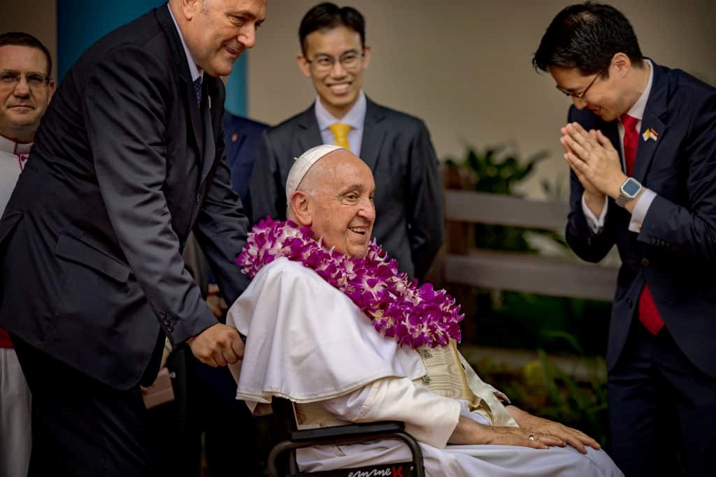Đức Giáo Hoàng Phanxicô được chào đón khi đến tham dự cuộc đối thoại liên tôn với một nhóm thanh thiếu niên tại Cao đẳng Công Giáo ở Singapore, Đảo Singapore, ngày 13 tháng 9 năm 2024. (Ảnh của Ezra Acayan/Getty Images