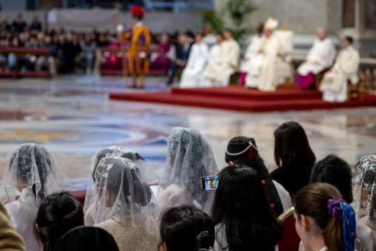 Những người Công Những người Công Giáo trẻ tuổi từ Hàn Quốc tham gia vào lễ trao tặng biểu tượng Đức Mẹ Maria trong Thánh lễ Lễ trọng Chúa Kitô Vua, do Đức Giáo Hoàng Phanxicô chủ trì tại Vương cung thánh đường Thánh Phêrô vào ngày 24 tháng 11 năm 2024, n