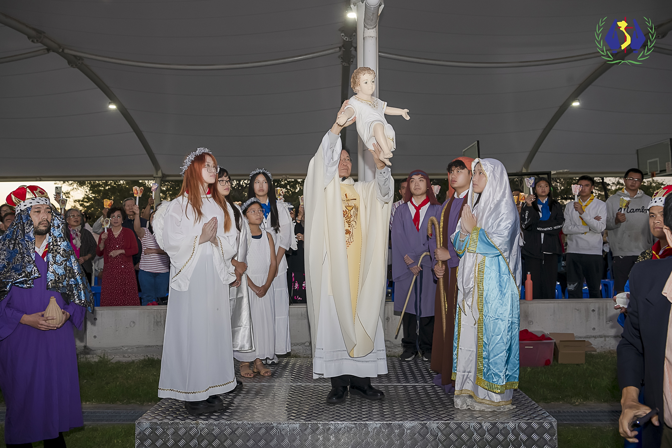 Với tâm tình chờ mong Đấng Thiên Sai giáng sinh, cả ngàn giáo dân cùng giơ cao nến sáng đón mừng giờ Chúa đến, và ca đoàn cùng giáo dân hát nhạc phẩm Nguyện Mùa Vọng: “Từ trần gian con ngước trông lên Chúa Ơi..” Hình ảnh Chúa Hài Nhi Giêsu giáng sinh với lời lời dẫn nhập: “Hôm nay, Chúa Kitô, Đấng Cứu Thế, đã Giáng Sinh cho chúng ta. Này một Hài Nhi đã sinh ra cho chúng ta. Một Hoàng Tử đã chào đời cho chúng ta. Ngai vua ở trên vai Người, và Người nắm quyền Vương Đế (Is. 9:6). Người chính là Hài Nhi Giêsu đã Giáng Sinh cho chúng ta đêm nay, Đêm Cực Thánh của năm 2024. Chúng ta hãy vui lên và cùng với các Thiên Thần cất cao tiếng hát chúc tụng Đấng nhân loại đợi mong đã đến, hãy vang lên niềm vui yêu thương và an bình với đất trời, với những khúc nhạc êm đềm đầy diệu vợi, để mừng đón Thiên Chúa xuống thế Cứu Độ nhân loại. Ba Vua đi lên lễ đài để kêu gọi: “Hãy cầu nguyện cho khắp nhân gian được biết đến Tin Mừng Giáng Sinh, và cho mọi tâm hồn cảm nhận được niềm hân hoan, hy vọng, yêu thương và an bình. Xin Chúa Hài Nhi Giêsu Giáng Sinh chúc lành cho Cộng Đồng chúng con…” Phần cung nghinh Chúa Hài Nhi Giêsu từ cuối sân lên Lễ Đài theo thứ tự: