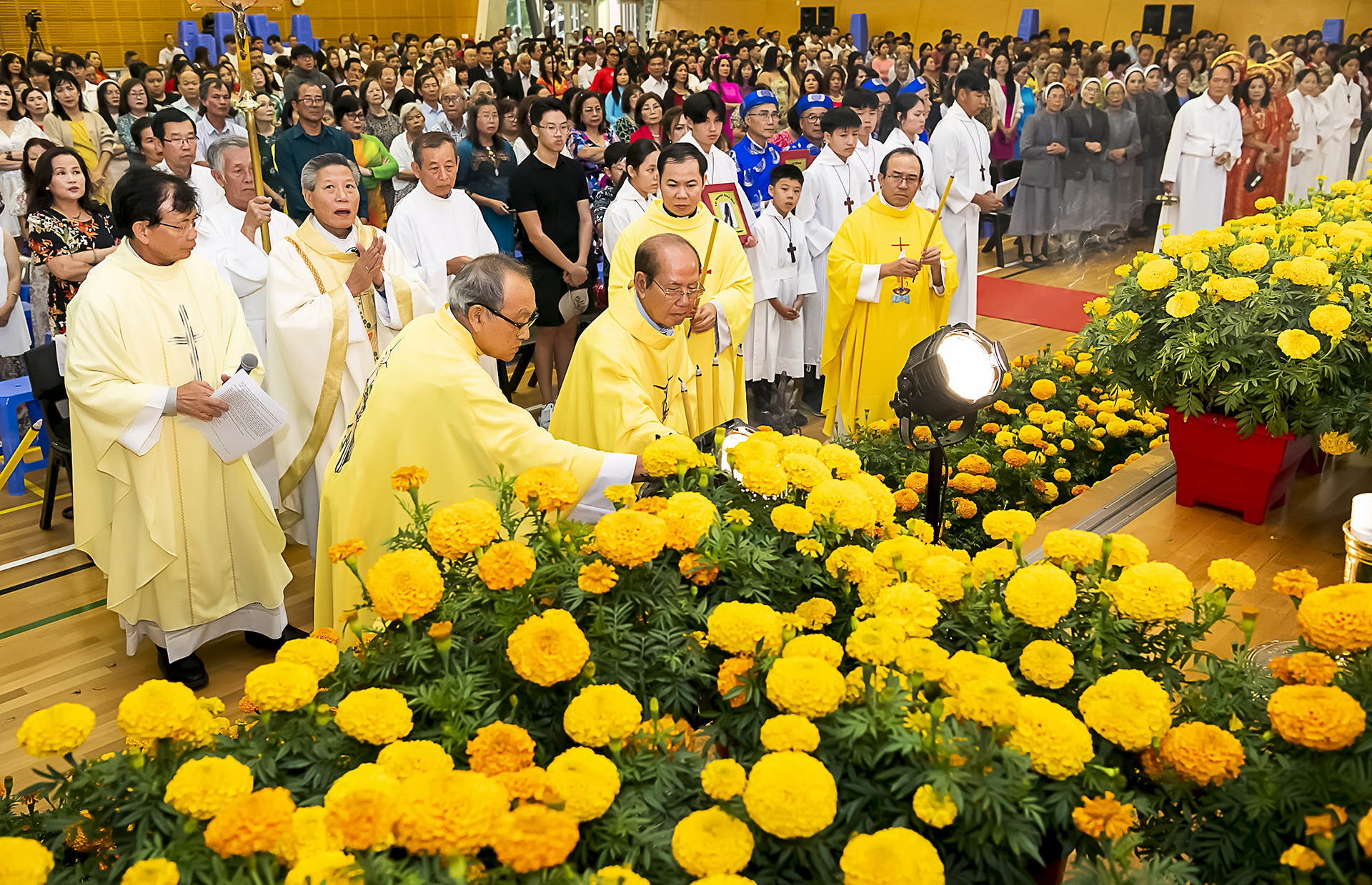 Cộng Đoàn dân Chúa đứng lên cùng đoàn Lễ Nghi Phụng vụ và quý Cha đồng tế khai mào Thánh Lễ, tiến lên lễ đài từ cuối hội trường, cùng lúc đó ca đoàn cùng hát vang lên ca nhập lễ. Đi đầu đoàn rước là Nhang, Thánh Giá nến cao, Các em Thiếu Nhi giúp lễ, đoàn quốc phục gồm có người đọc sách Thánh, Lời nguyện giáo dân, và đoàn dâng lễ vật, các Thừa Tác Viên, Quý Cha, Cha Chủ Tế với 7 Quý cha đồng tế tối nay.