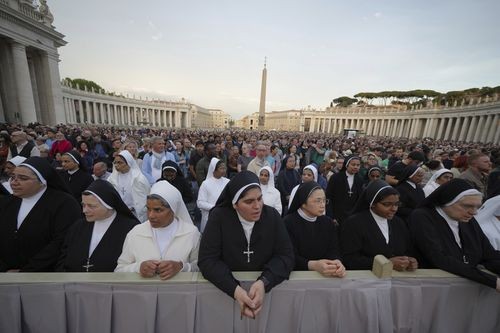 Một buổi cầu nguyện kinh mân côi vừa bắt đầu tại quảng trường trong lễ tưởng niệm công khai đầu tiên của giáo hội sau khi Đức Giáo Hoàng Phanxicô qua đời.