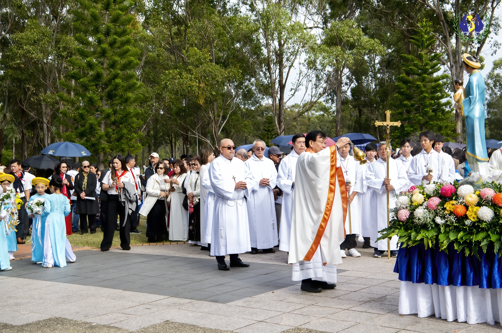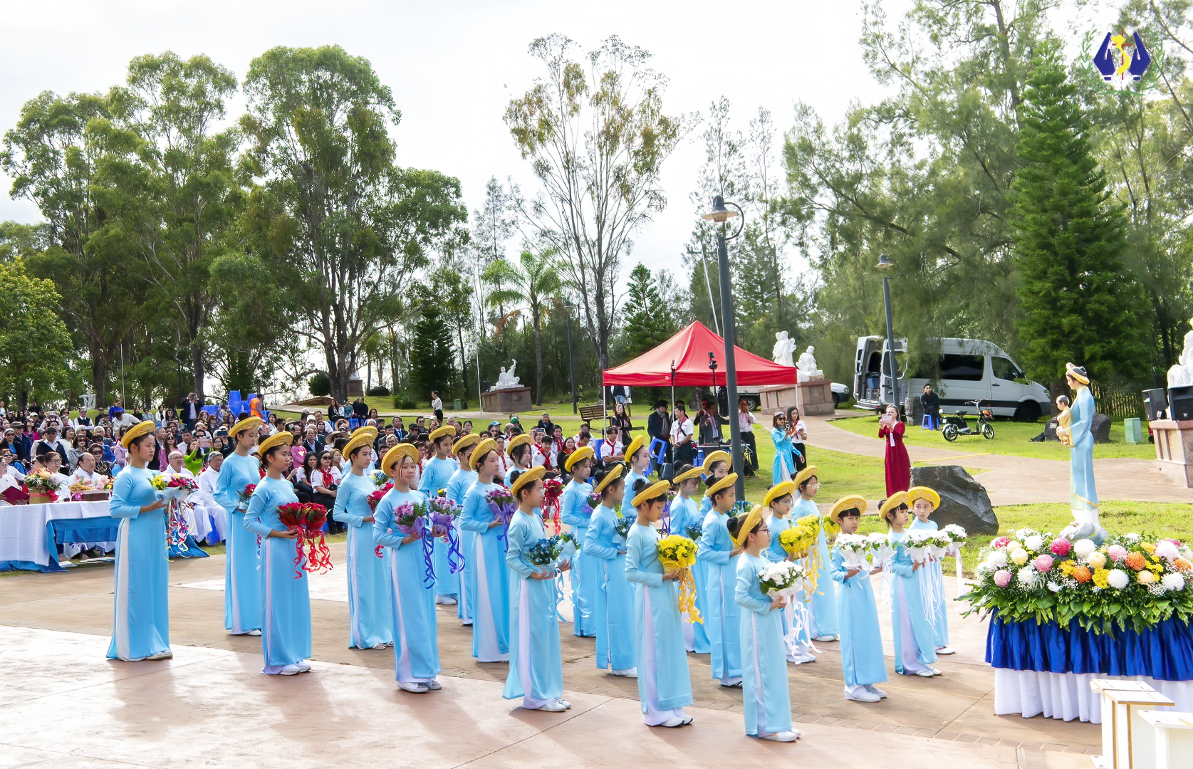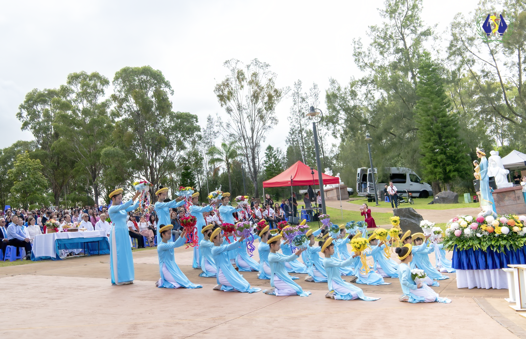 Cuộc rước Cung Nghinh Đức Mẹ đoàn rước vừa đi vừa lần hạt 5 sự mừng cầu cho Cộng Đồng và Gia Đình, về gần tới nơi khán đài hành lễ chính mọi người cùng cất tiếng hát chung bài: Mẹ Rất Nhân Từ. Đoàn người Rước Kiệu Đức Mẹ về Lễ Đài chính tại trung tâm, và diễn ra một Thánh Lễ đồng tế trọng thể gồm 4 Cha. Nguyễn Văn Tuyết tuyên úy cộng đồng Công Giáo chủ tế Thánh Lễ hôm nay, Cha Trần Văn Trợ giảng thuyết nói về Mẹ Hiền Mẫu. Trước Thánh Lễ nghi thức dâng hoa do cộng đồng Công Giáo Việt Nam TGP Sydney được tổ chức trong ngày Hành Hương về bên Mẹ tại Trung Tâm Thánh Mẫu Bringelly, với đoàn dâng hoa gồm thiếu nhi. Họ mặc trang phục truyền thống áo dài trắng, tay ôm bó hoa, tiến dâng những tràng hoa rực rỡ, kèm theo các điệu múa, bài ca kính Mẹ. Tuy nhiên, việc dâng hoa không chỉ dừng ở nghi lễ bên ngoài. Dâng Hoa – Một nghĩa cử yêu thương, không thể thiếu trong tháng Hoa.